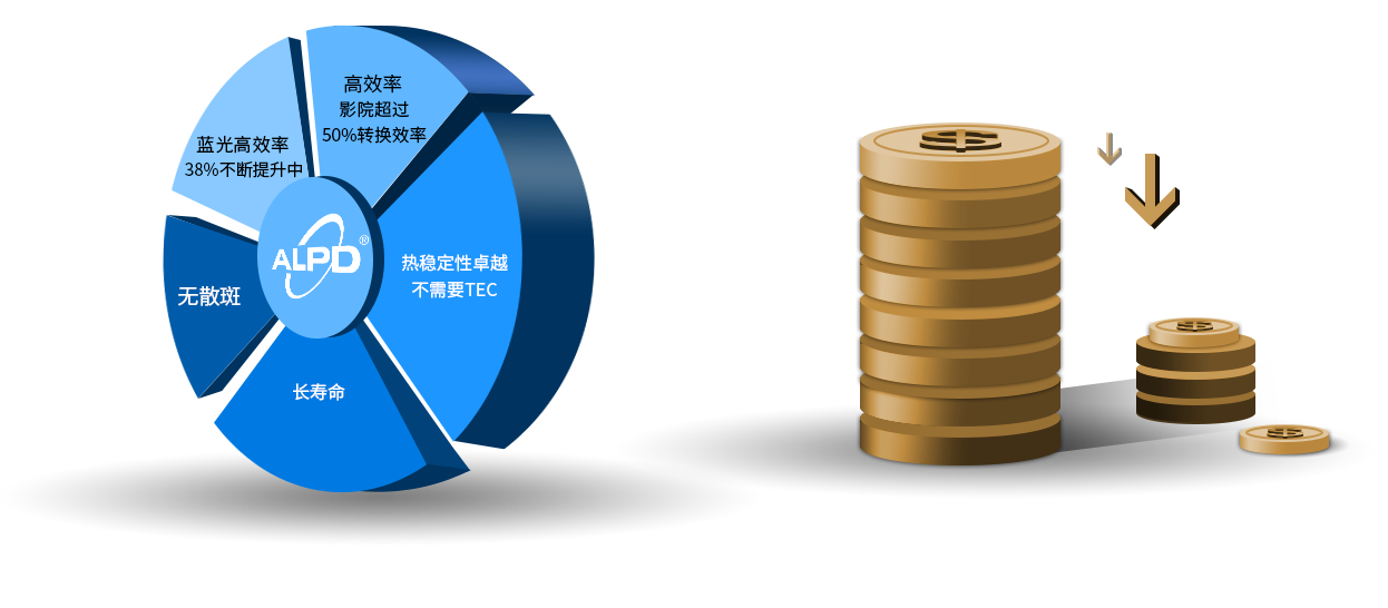 ALPD技術(shù)敏銳地察覺了激光技術(shù)結(jié)合稀土材料在高亮度投影光源上的可行性,創(chuàng)造性地提出了ALPD技術(shù)架構(gòu),實現(xiàn)了具有了低成本、高亮度、廣色域、無散斑等特點的激光光源,革命性地解決了激光顯示產(chǎn)業(yè)化遇到的困難,實現(xiàn)了激光技術(shù)的民用化,逐步應(yīng)用于顯示、照明等。